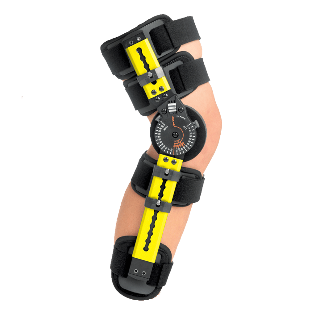 A post-op knee brace with telescoping bars to accommodate varying leg lengths.