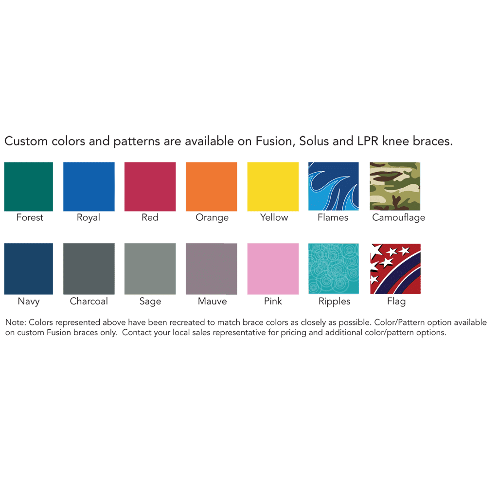 *Note: Colors represented above have been recreated to match brace colors as closely as possible. The actual brace color may vary. Color / Pattern option available on custom Fusion braces only. Contact your local sales representative for pricing and additional color / pattern options.